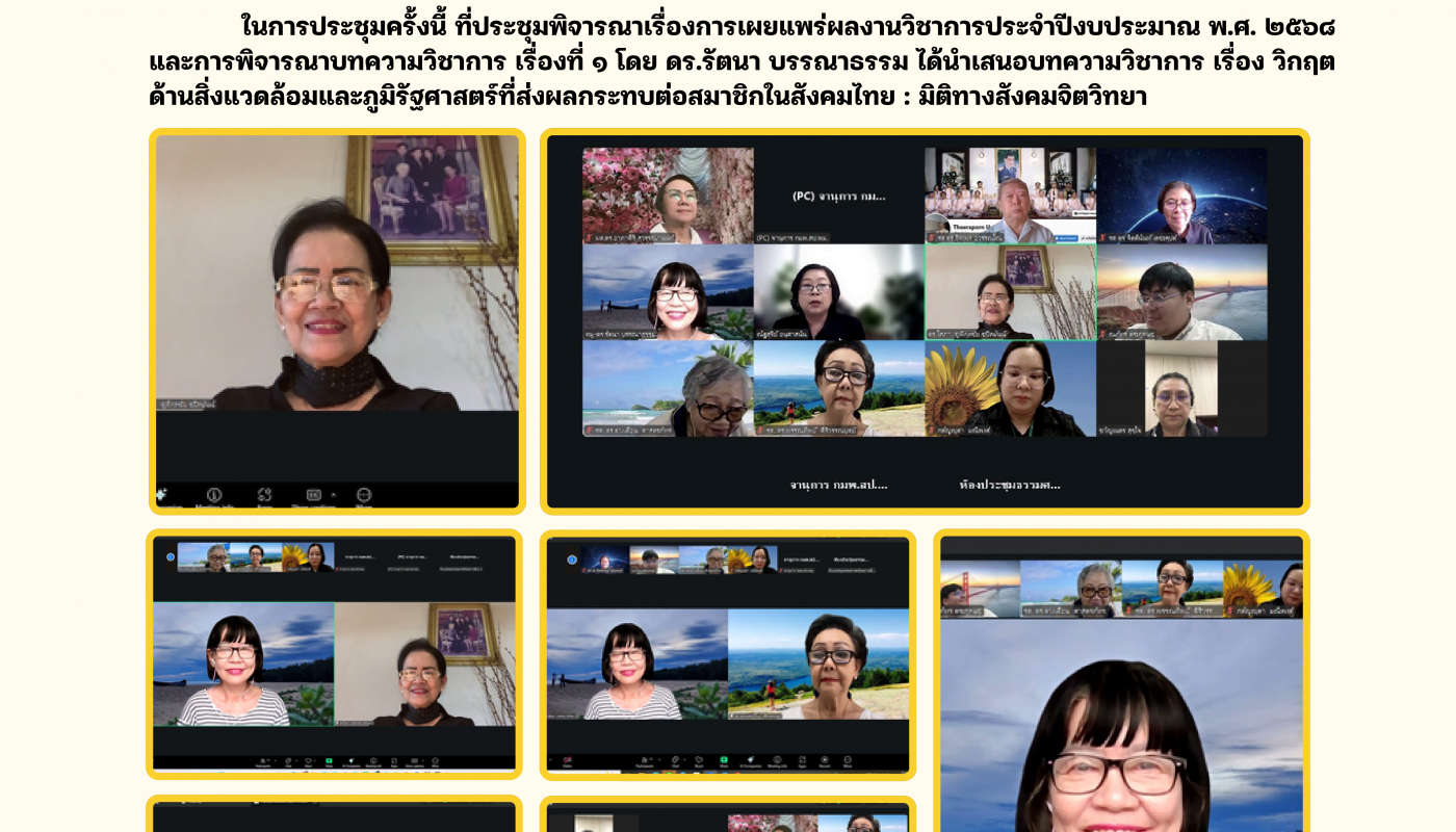 การประชุมคณะกรรมการศึกษาและพัฒนาความรู้ทางจิตวิทยาและสังคม ครั้งที่ ๑๙/๒๕๖๘ เมื่อวันศุกร์ที่ ๑๒ ธันวาคม พ.ศ. ๒๕๖๘ ณ ห้องประชุมกองธรรมศาสตร์และการเมือง สำนักงานราชบัณฑิตยสภา และผ่านระบบการประชุมอิเล็กทรอนิกส์ (Zoom Workplace)